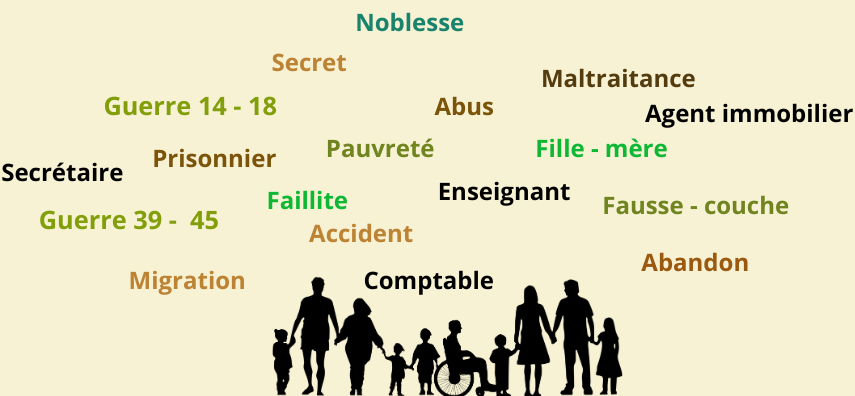 Je recueille les données de votre arbre généalogique : dates, prénoms, noms de famille, événements marquants tels que les guerres, les migrations, les abandons, les maladies, les traumatismes, les accidents, etc… sur 3 générations ou plus (vous, vos parents et grands-parents).